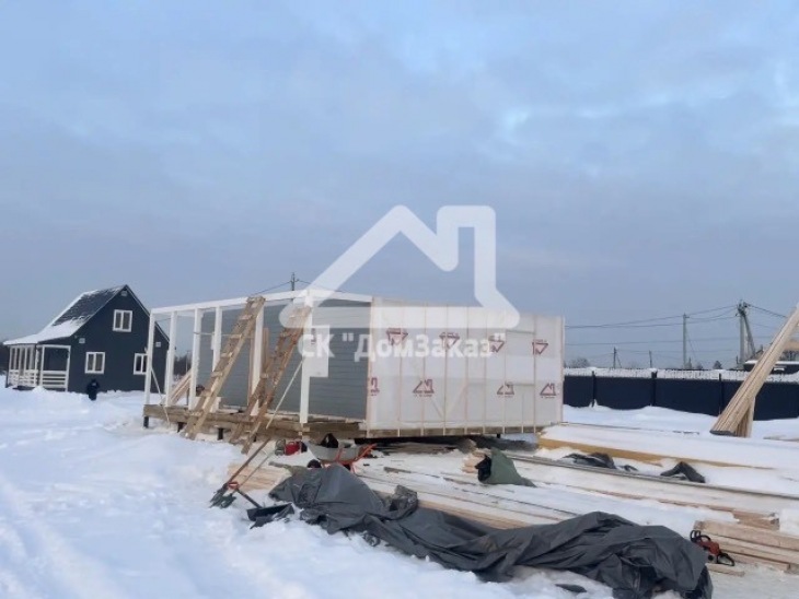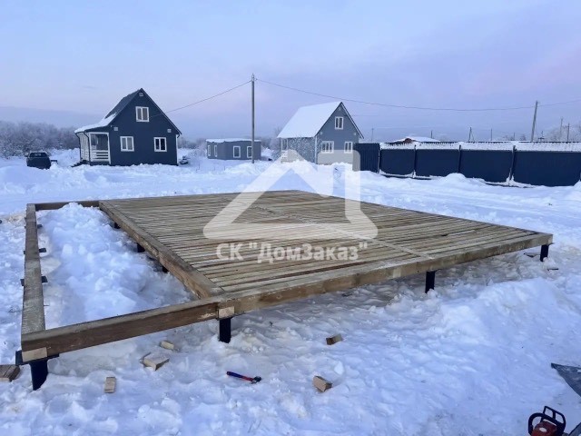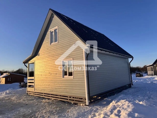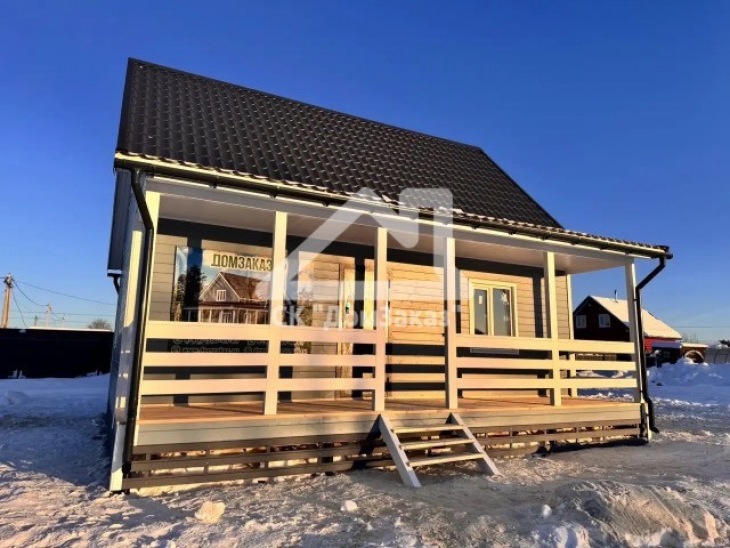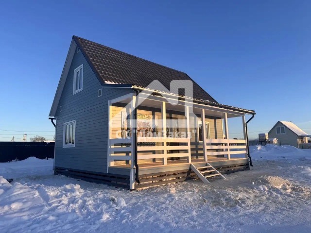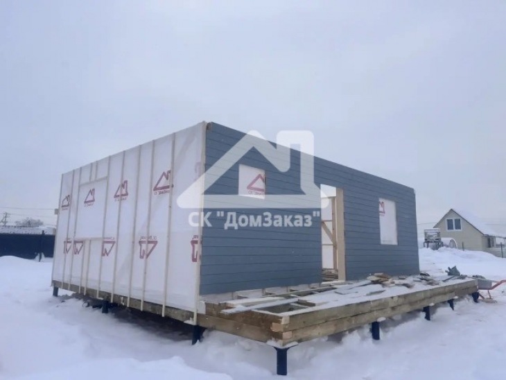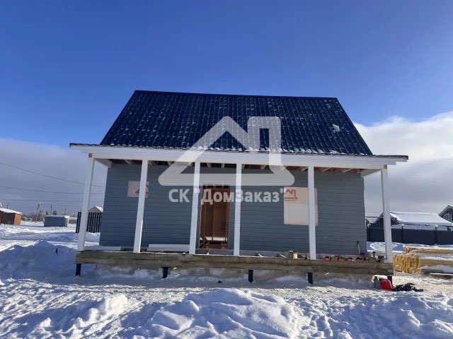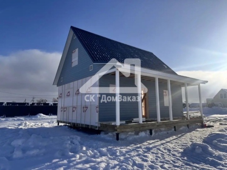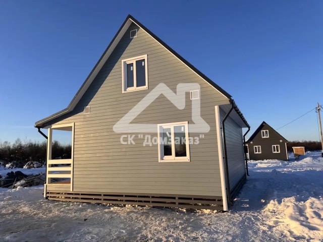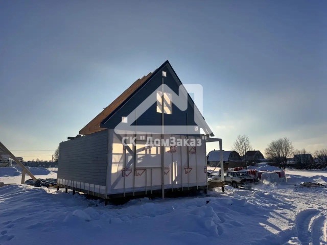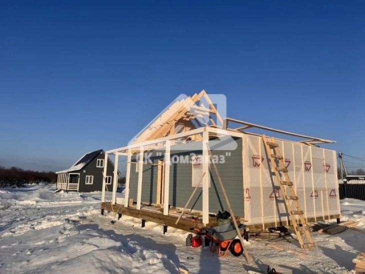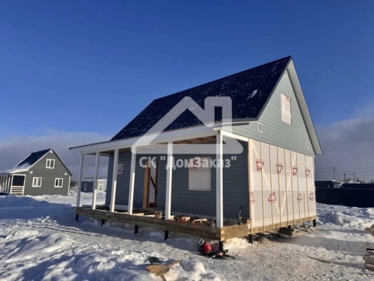 Строительство каркасного одноэтажного дома 6х8 м впоселке Назия, Кировского района, Ленинградской области: наружная отделка имитация бруса камерной сушки окрашена, внутренняя отделка – вагонка, утепление 150 мм, окна ПВХ двухкамерные с подоконниками и отливами, кровля металлочерепица, фундамент свайно-винтовой, обработка силовой рамы и чернового пола антисептиком. Наружная покраска фасада выполнена краск ой Tikkurila Pika-Teho Classic в цвете 2683. Бытовка для проживания бригады размером 2х3м.