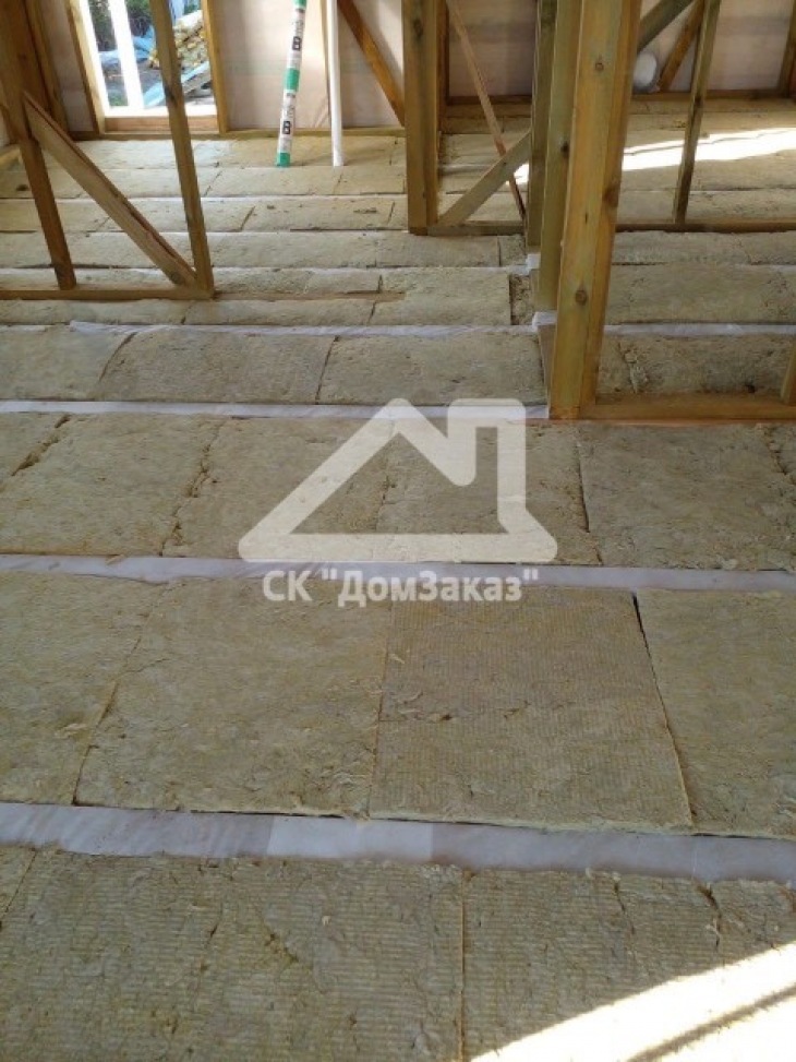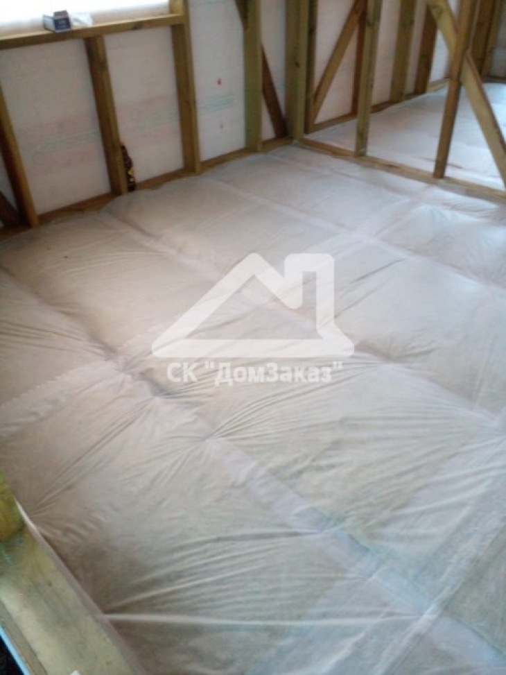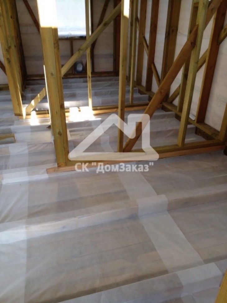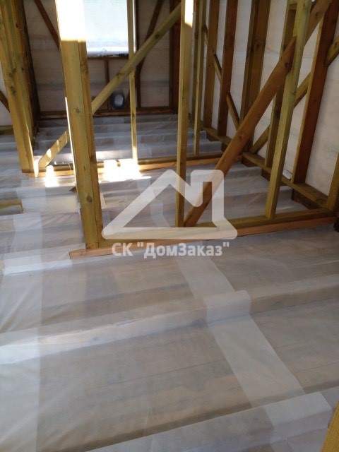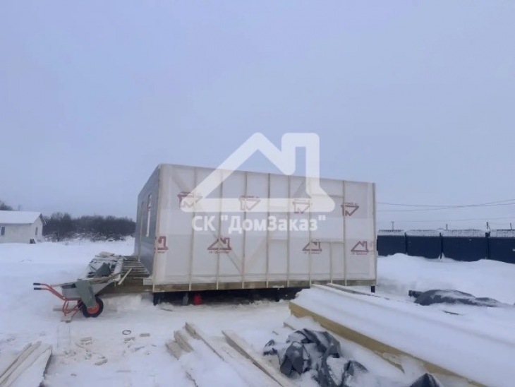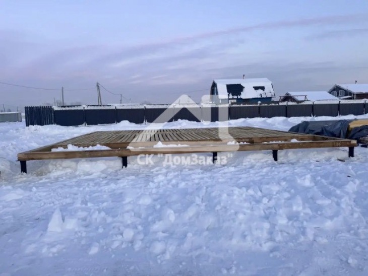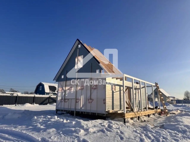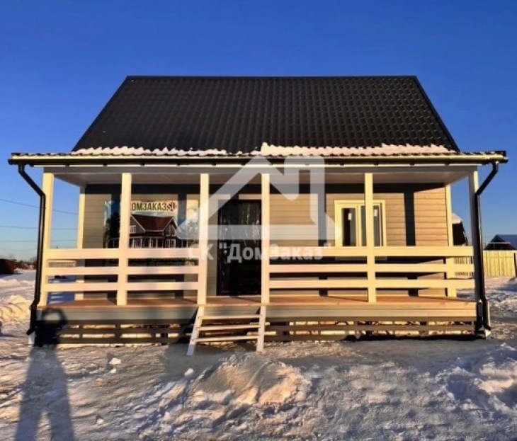 Строительство каркасного одноэтажного дома 6х8 м впоселке Назия, Кировского района, Ленинградской области: наружная отделка имитация бруса камерной сушки окрашена, внутренняя отделка – вагонка, утепление 150 мм, окна ПВХ двухкамерные с подоконниками и отливами, кровля металлочерепица, фундамент свайно-винтовой, обработка силовой рамы и чернового пола антисептиком. Наружная покраска фасада выполнена краск ой Tikkurila Pika-Teho Classic в цвете 2683. Бытовка для проживания бригады размером 2х3м.
