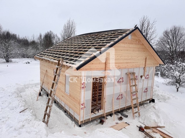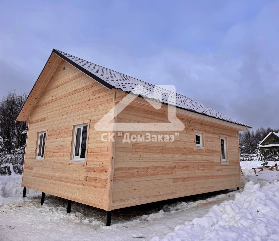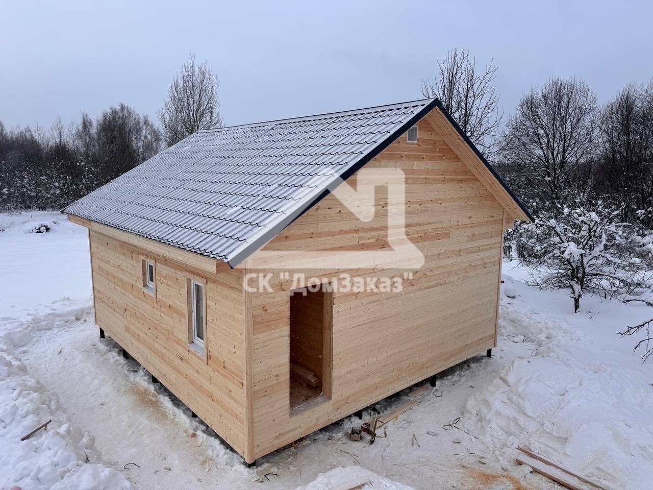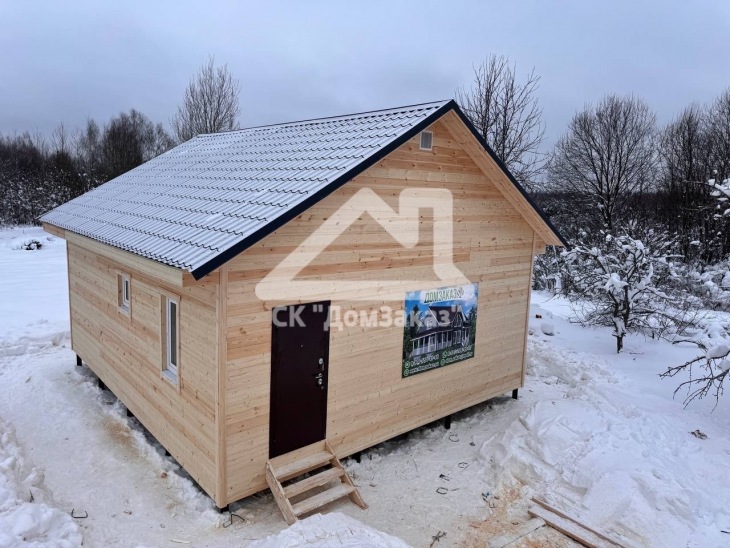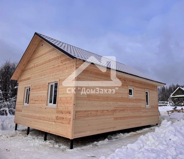 Строительство каркасного одноэтажного дома 7х8 м в д.Губино, Воскресенского г.о, Московской области: наружная отделка имитация бруса камерной сушки, внутренняя отделка – вагонка, утепление 200 мм, окна ПВХ двухкамерные с подоконниками и отливами, кровля металлочерепица, фундамент свайно-винтовой L-3.5м, D-108мм, сетка от грызунов, обработка силовой рамы и чернового пола антисептиком. Бытовка для проживания бригады размером 2х3м.
