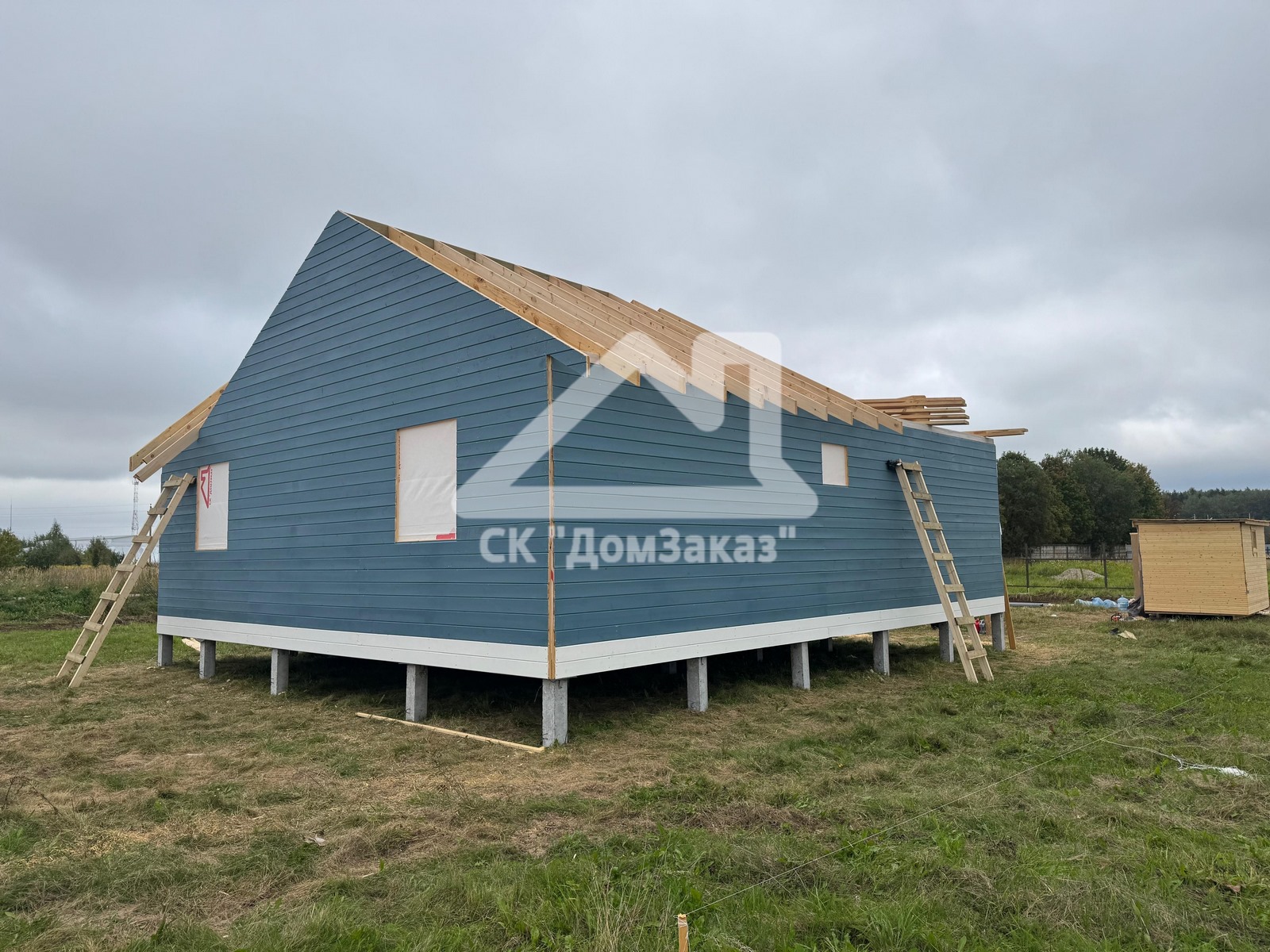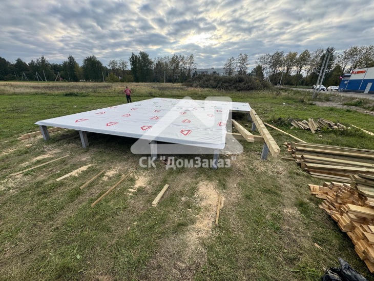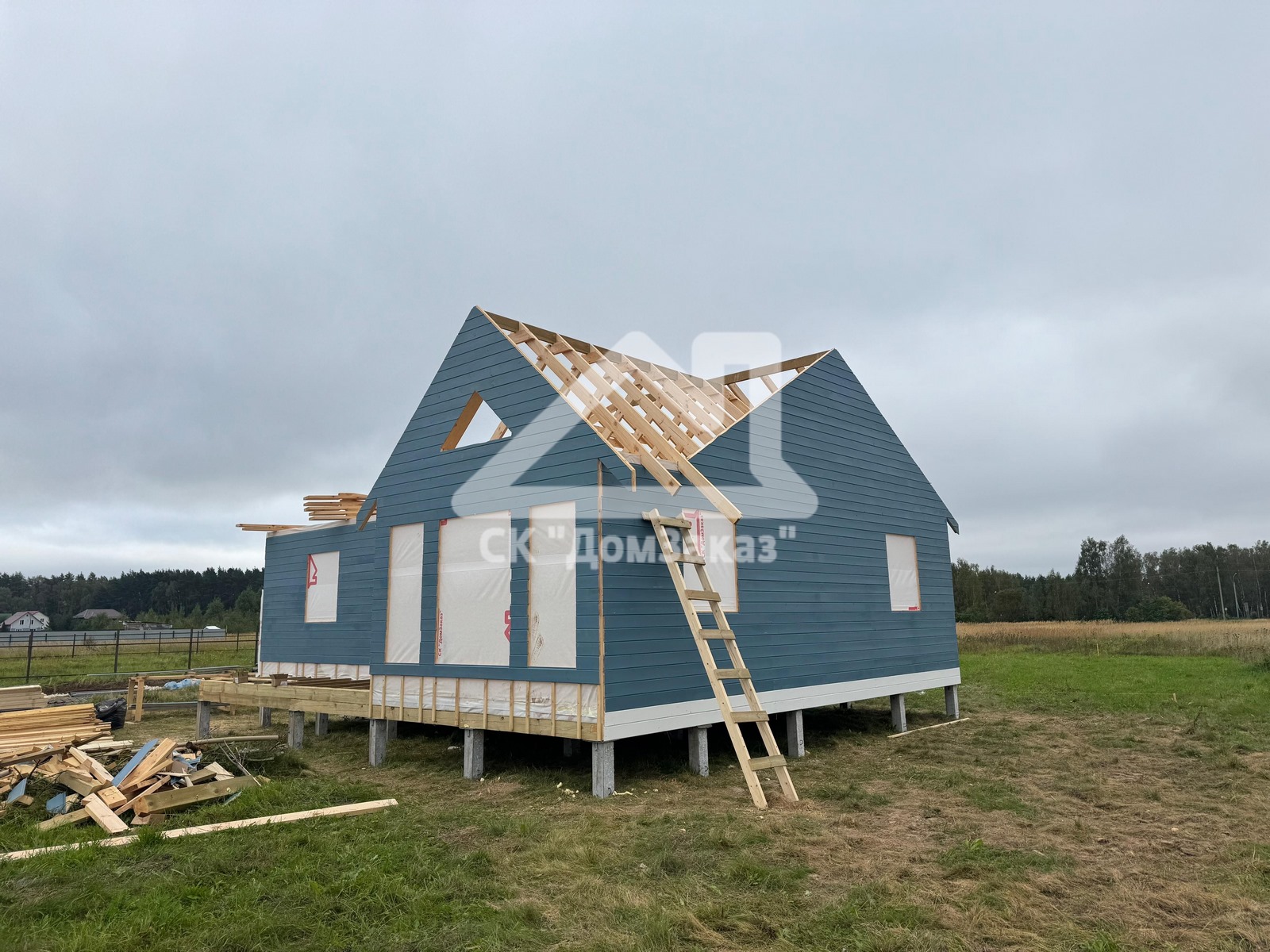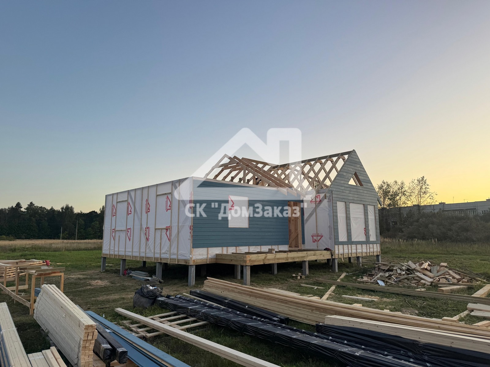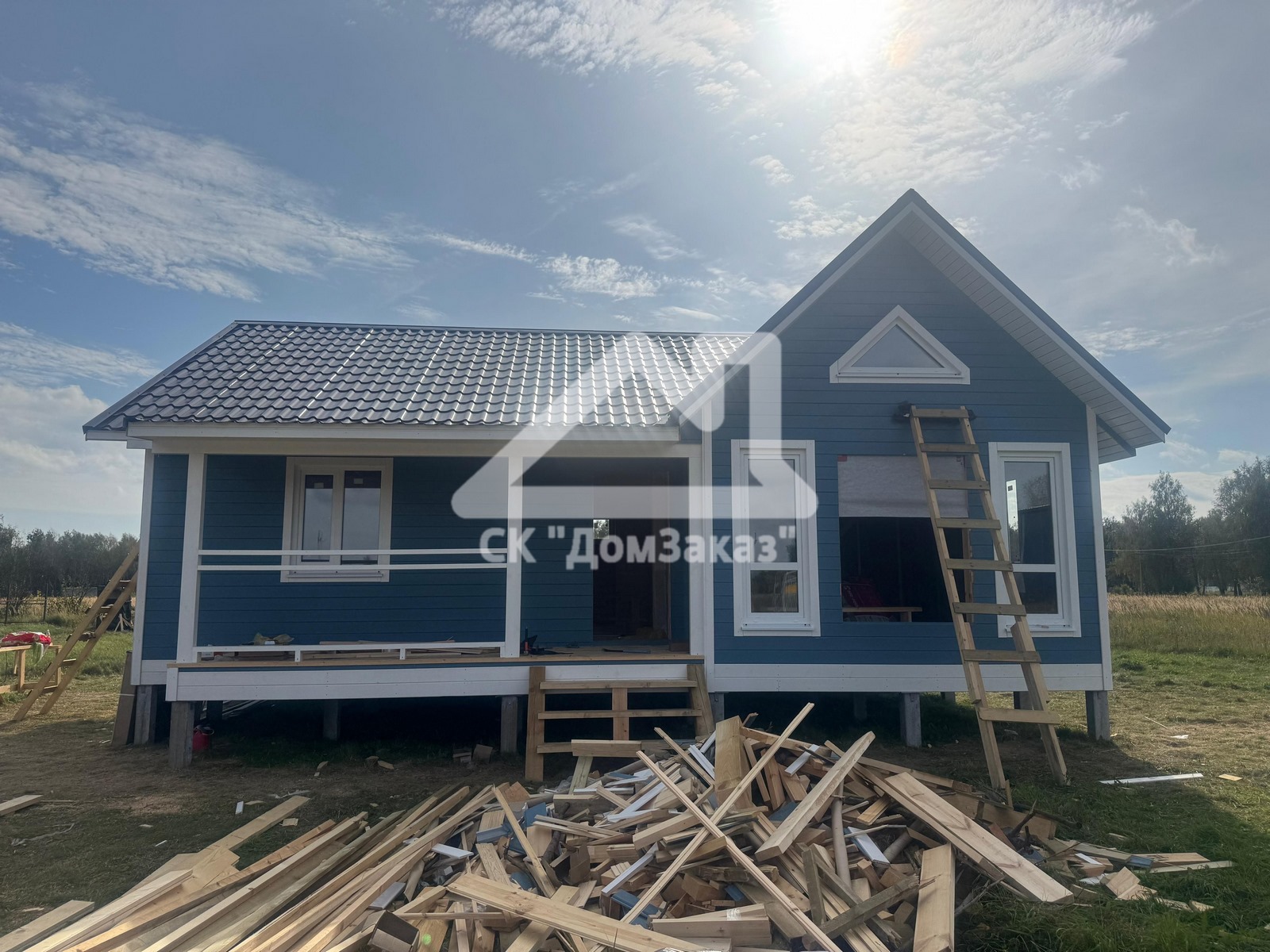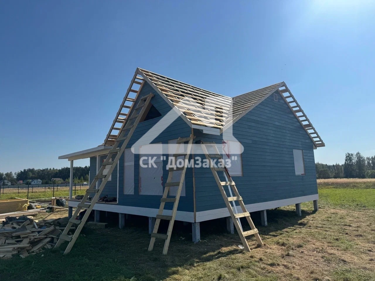Строительство каркасного одноэтажного дома 8,5х10м в село Ивановское: наружная и внутренняя отделка - имитация бруса камерной сушки, утепление 150 мм, домокомплект камерной сушки, строганный каркас, окна ПВХ двухкамерные с подоконниками и отливами, кровля - металлочерепица, фундамент железобетонные сваи, сетка от грызунов, обработка силовой рамы и чернового пола антисептиком. Наружная покраска фасада выполнена краской Tikkurila Pika-Teho Classic в цвете 4901. Входная металлическая дверь с терморазрывом.