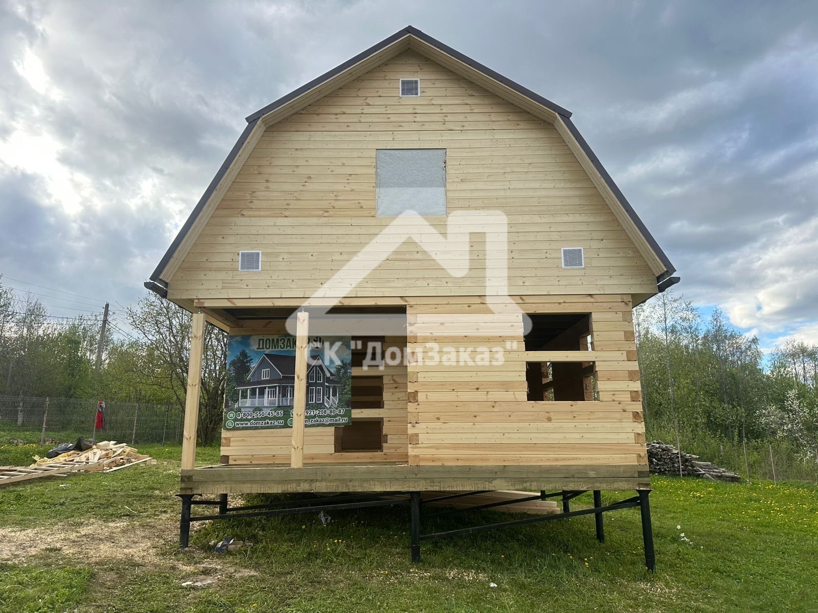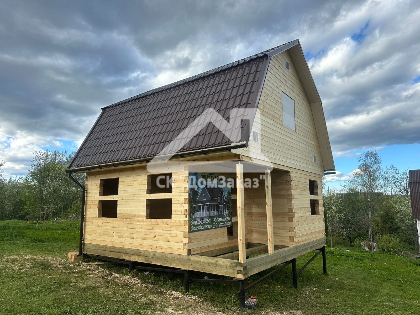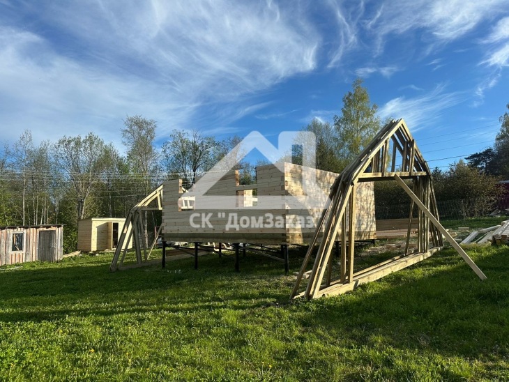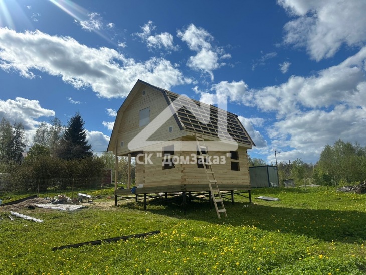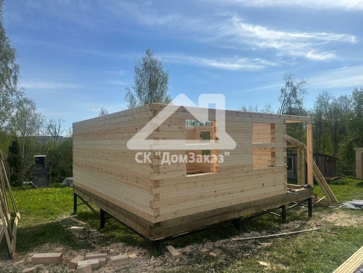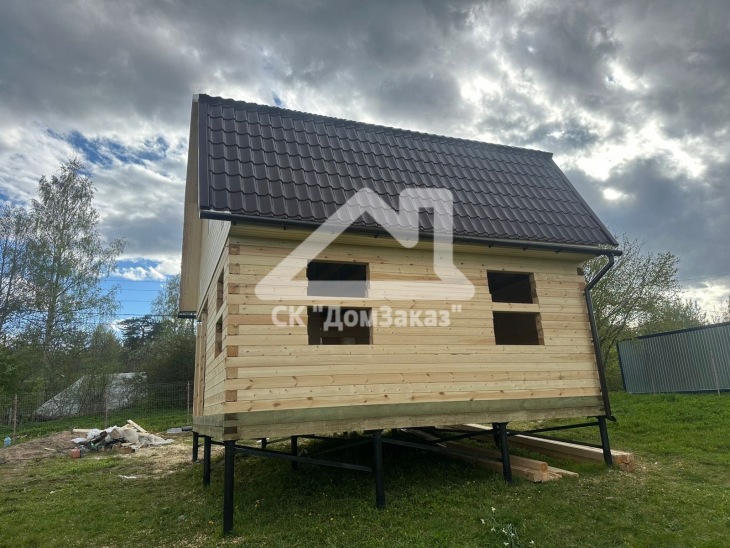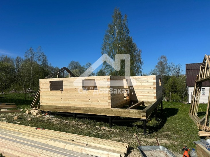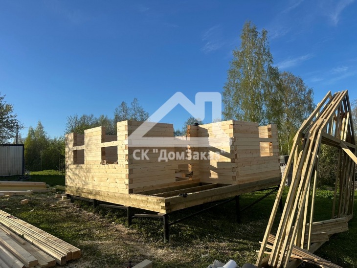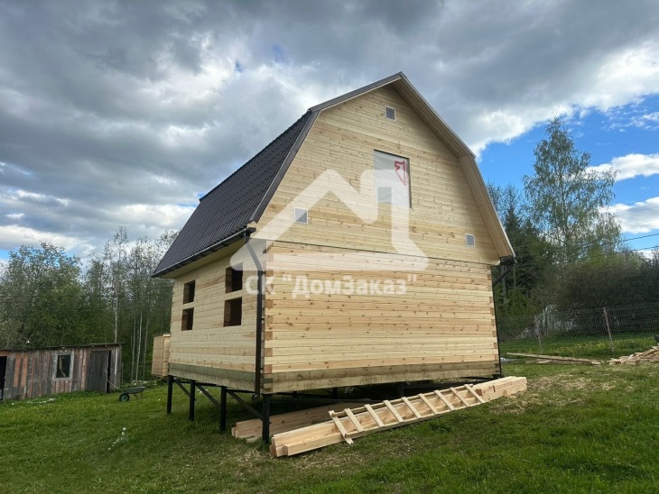 Строительство сруба 6х6м с мансардой в Ленинградской области, Приозерском районе, Громовском сельском поселении, п. Громово: профилированный брус естественной влажности 140х140мм, двойная обвязка, сетка от грызунов, кровля металлочерепица, обшивка фронтонов имитацией бруса камерной сушки
