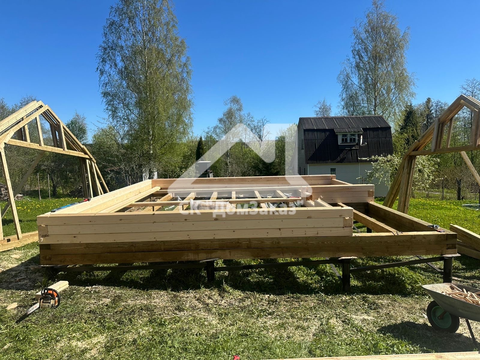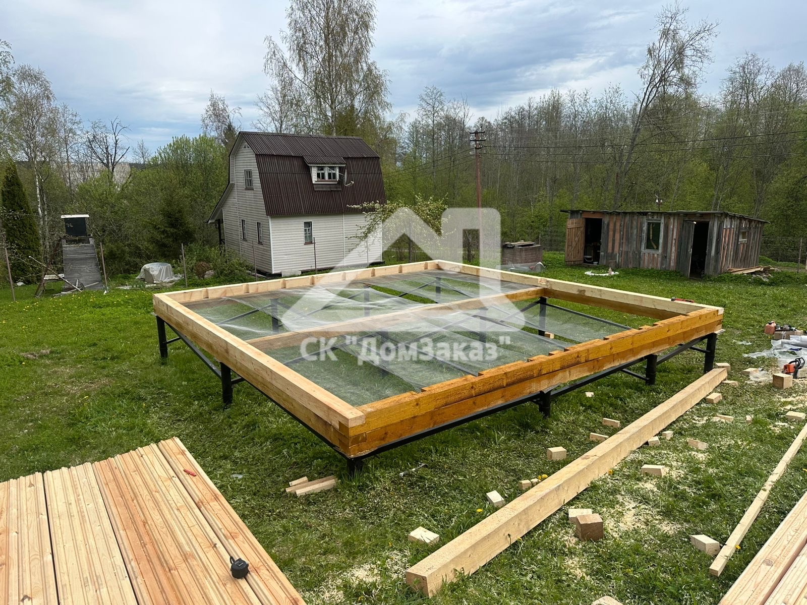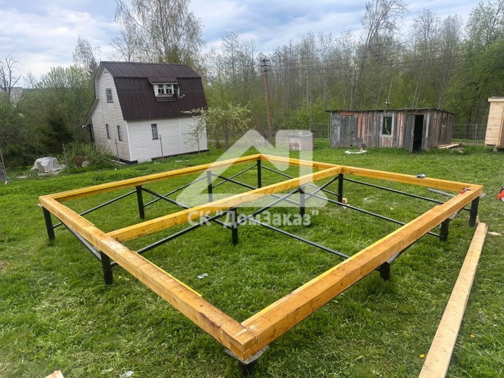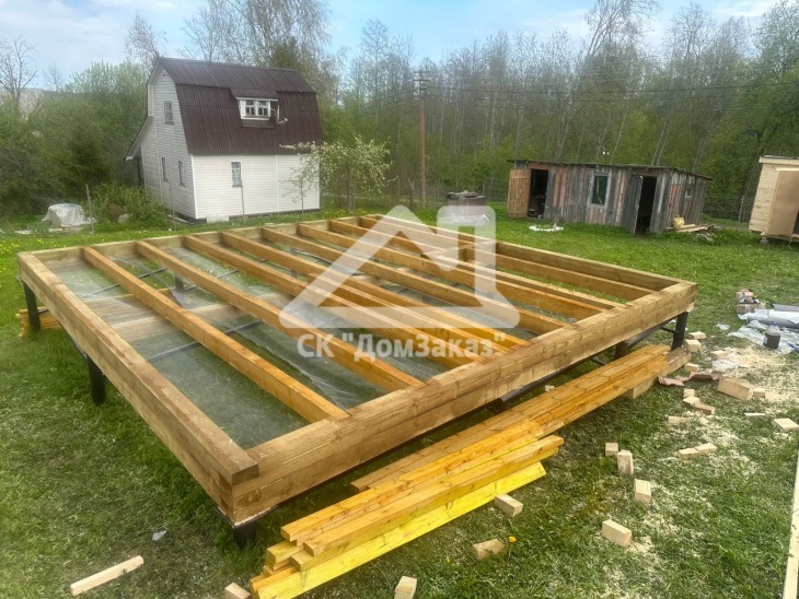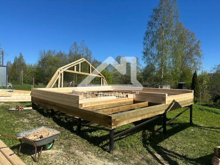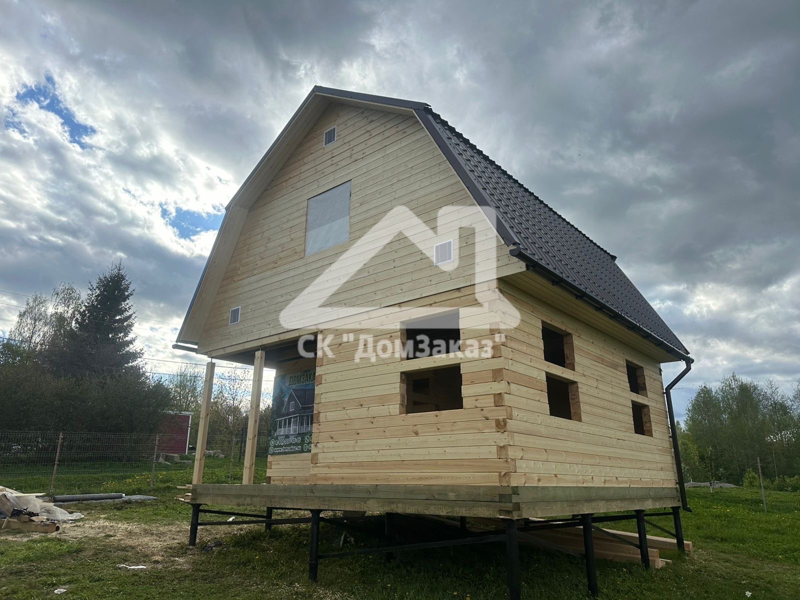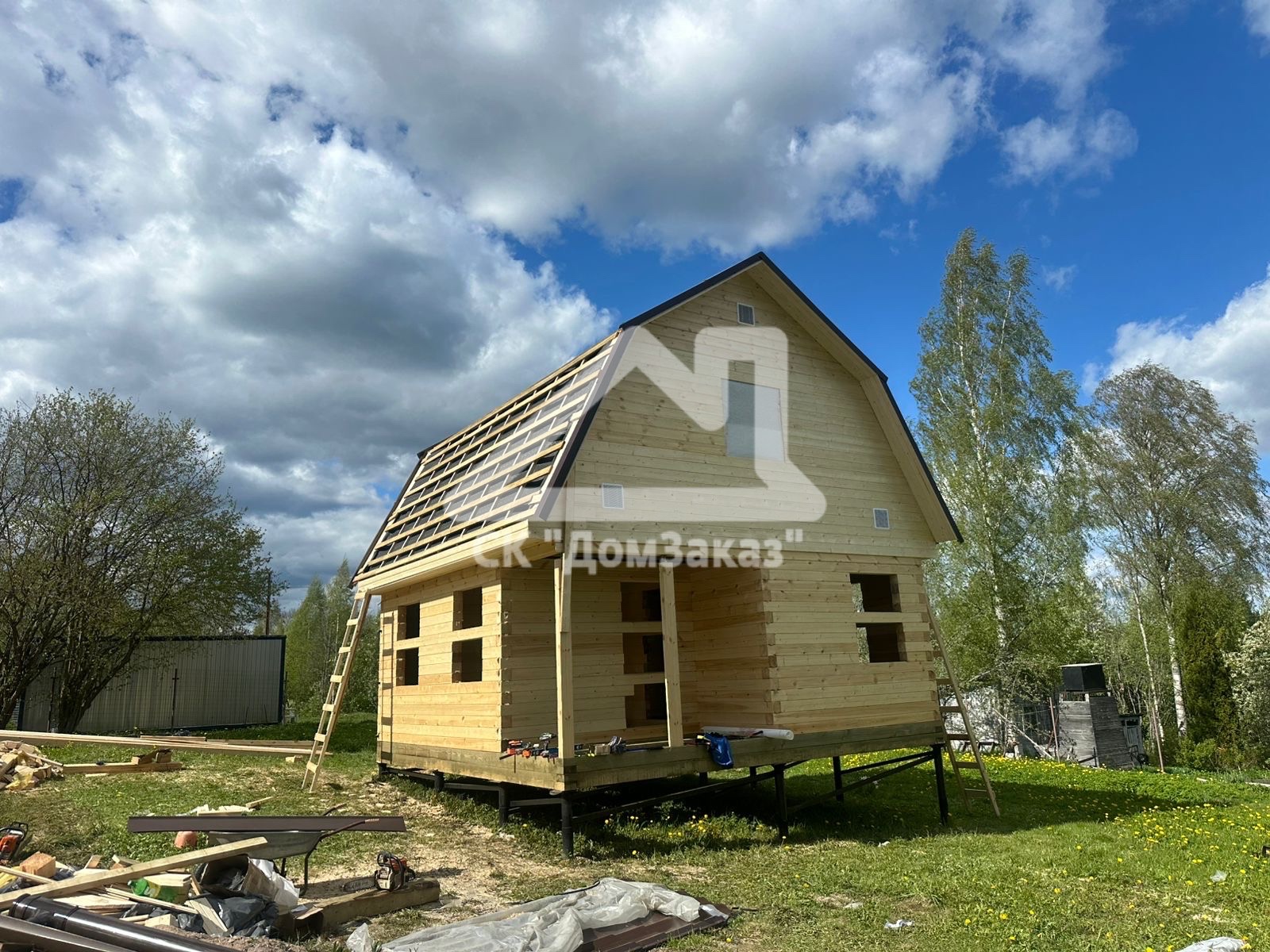 Строительство сруба 6х6м с мансардой в Ленинградской области, Приозерском районе, Громовском сельском поселении, п. Громово: профилированный брус естественной влажности 140х140мм, двойная обвязка, сетка от грызунов, кровля металлочерепица, обшивка фронтонов имитацией бруса камерной сушки