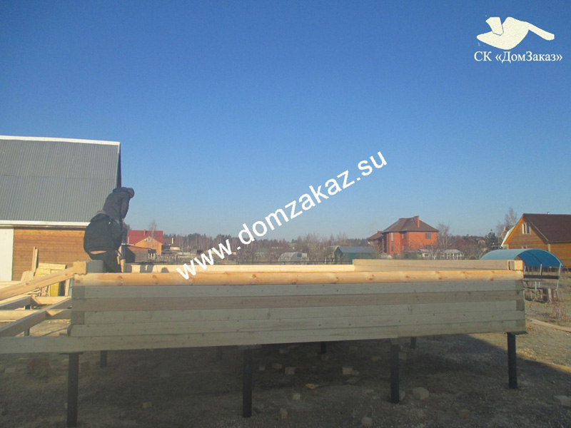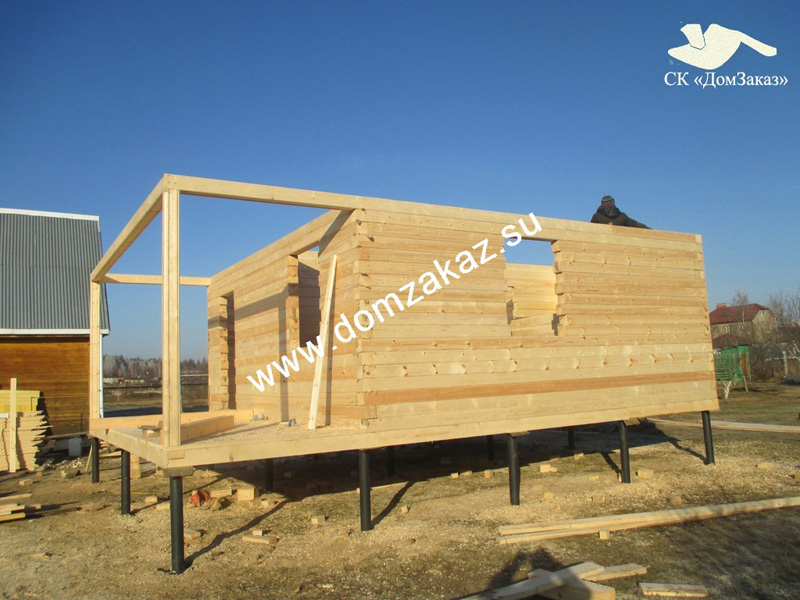 Строительство дома 6х8 м. в Калужской области, г. Жуков в ноябре 2014 года. Цена дома из профилированного бруса 140х140мм 678000 руб., дополнительное утепление до 100мм, обшивка фронтонов блок-хаус, кровля металлочерепица, навес 1х1,5м, сборка на деревянные нагеля, ройки в оконные и дверные проемы 1 этажа, свайно-винтовой фундамент.