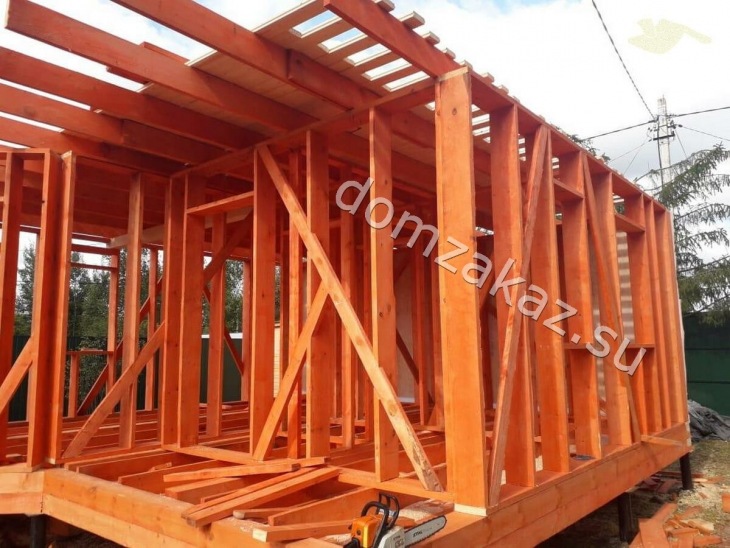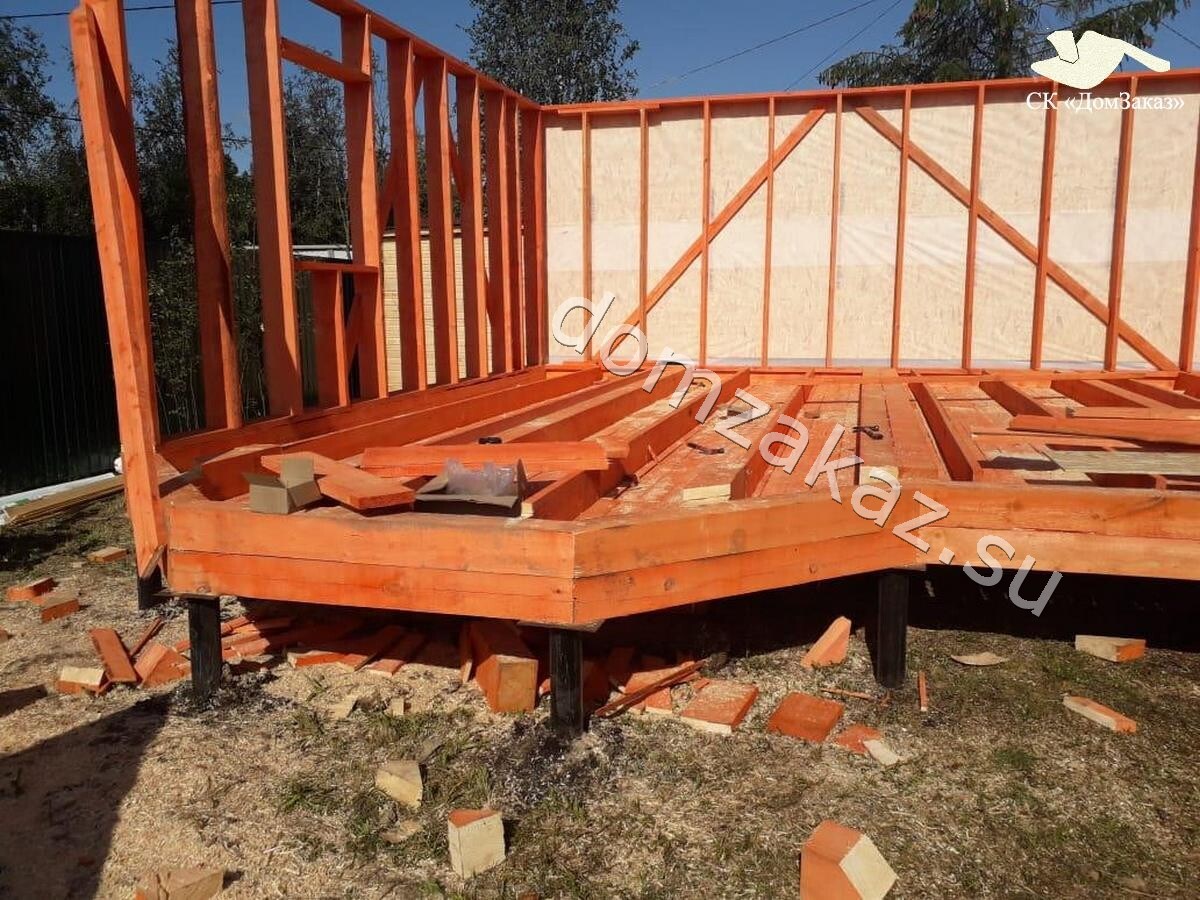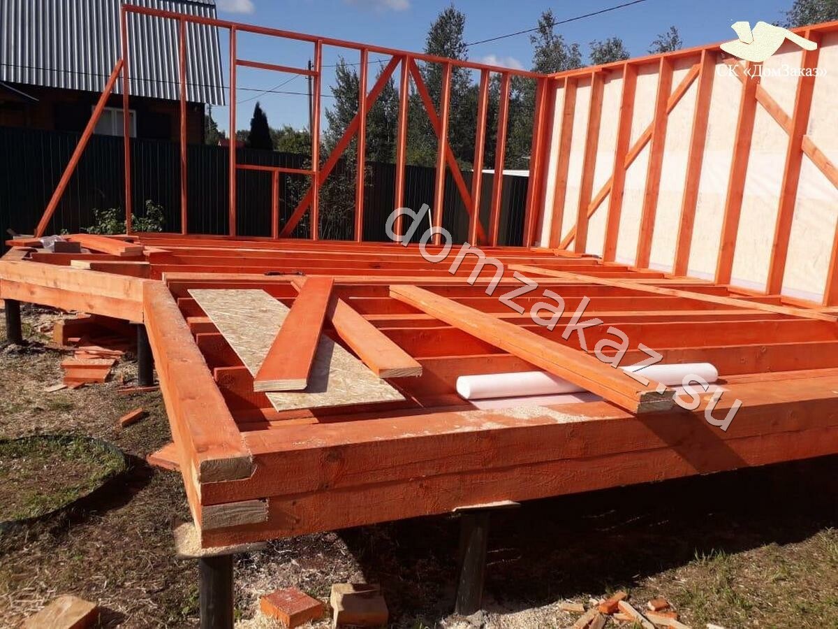 Строительство каркасного дома 7х7м в Московская область, Талдомский городской округ, садовое товарищество Мирный в июле 2019 года: каркас брусок 40х200 мм камерной сушки, обработанный антисептиком, утепление ROCKWOOL 200 мм, наружная отделка OSB, внутренняя отделка имитация бруса камерной сушки, кровля металлочерепица, свайно-винтовой фундамент.