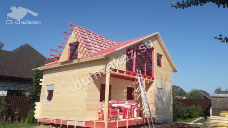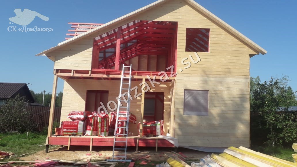 Строительство каркасного полутораэтажного дома 6х8м в Ленинградской области, Всеволожский район, Рахьинское г/п, деревня Коккорево в июле 2021 года. Наружная отделка имитация бруса камерной сушки, утепление 150мм, кровля металлочерепица, заводская обработка чернового материала антисептиком.